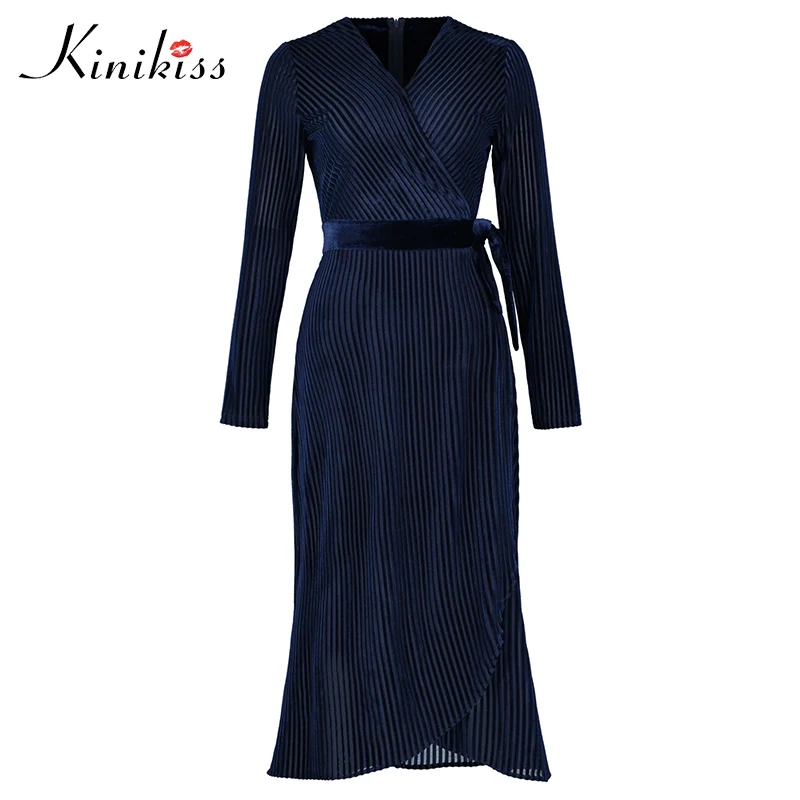 Beste Koop Kinikiss Vrouwen Elegante Fluwelen Jurk Donkerblauw V hals Wrap Riem Lange Mouw Jurk Dame Slanke Streep Mid Kalf kantoor Jurk Goedkoop